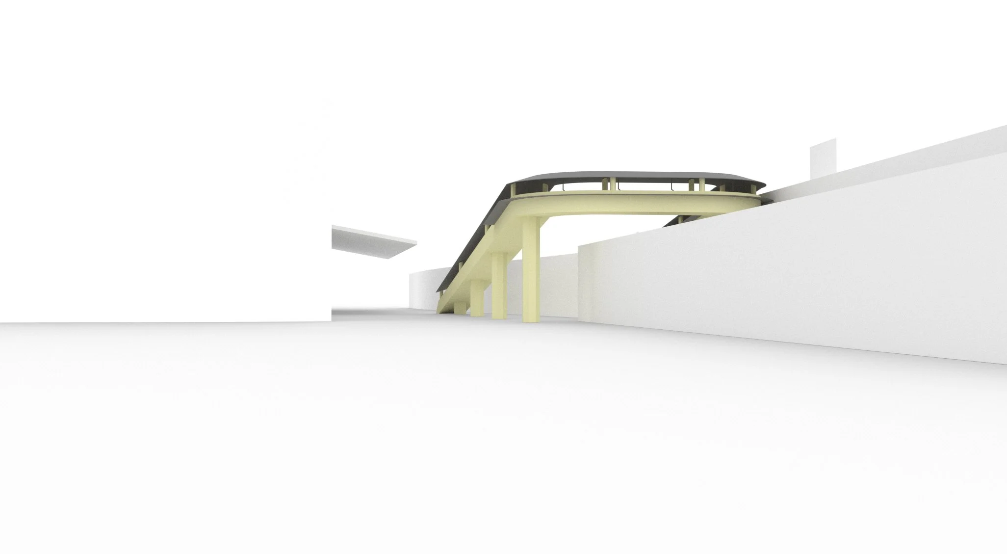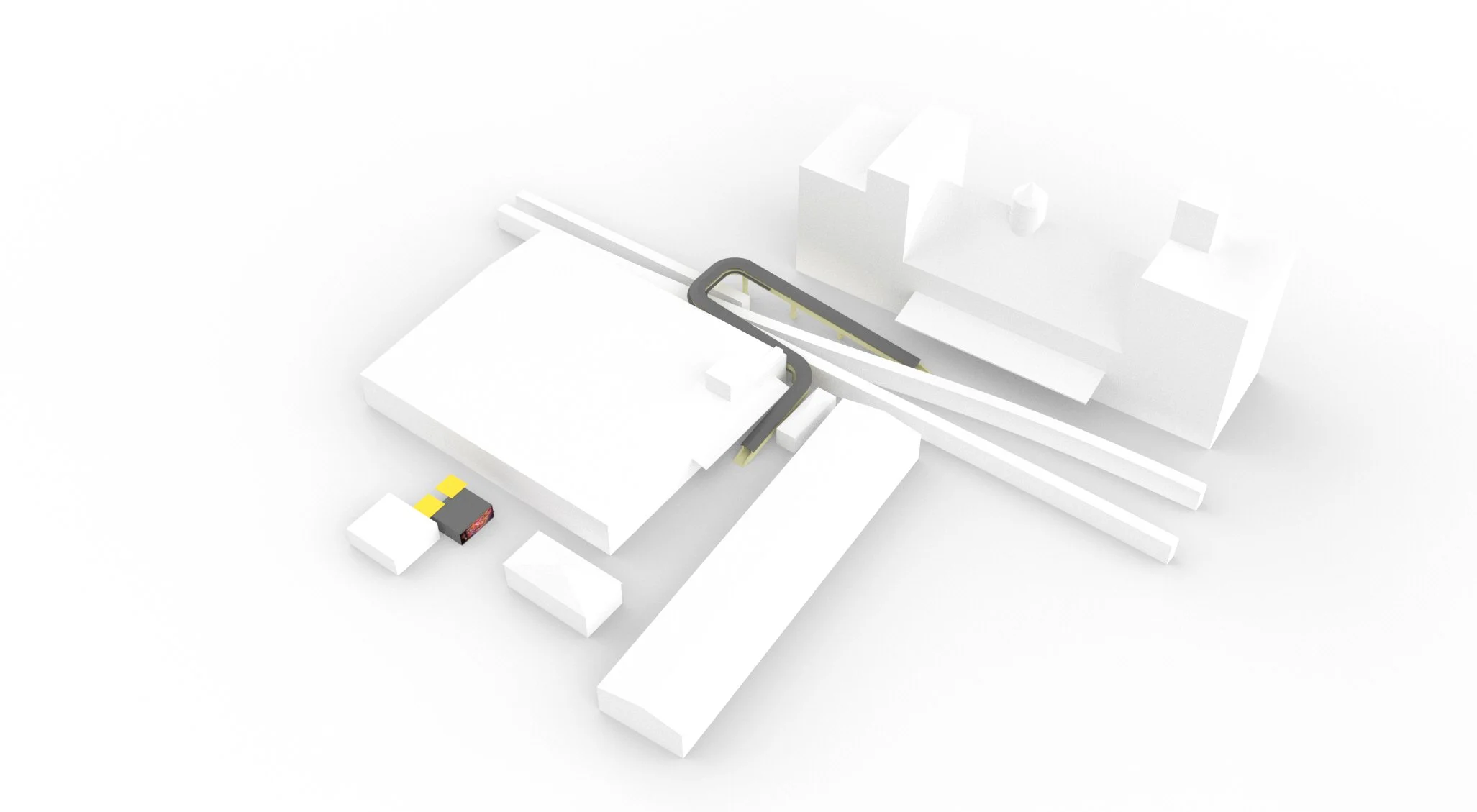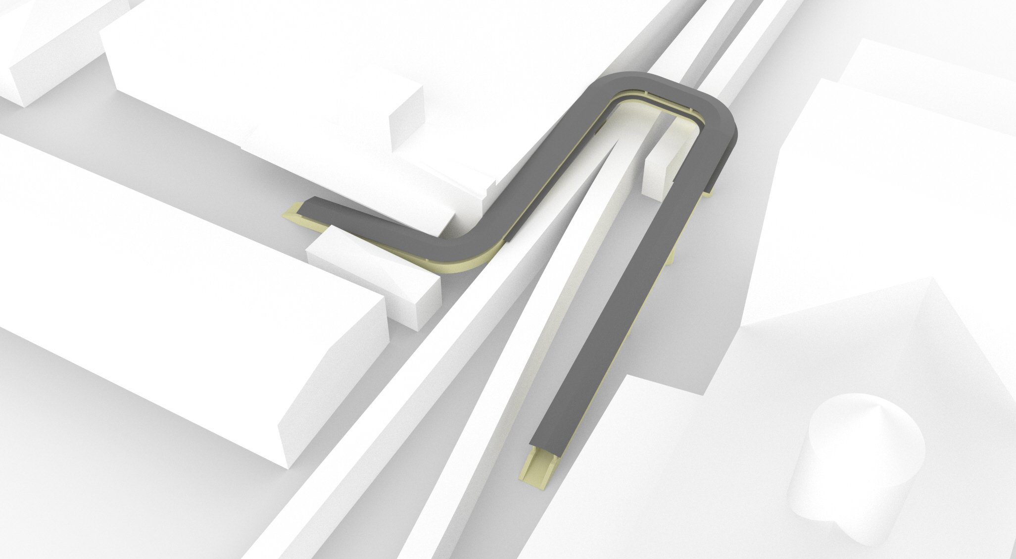 Bridge and access elements reused transport-pipe geometries from the site to connect the hub across the active rail tracks.