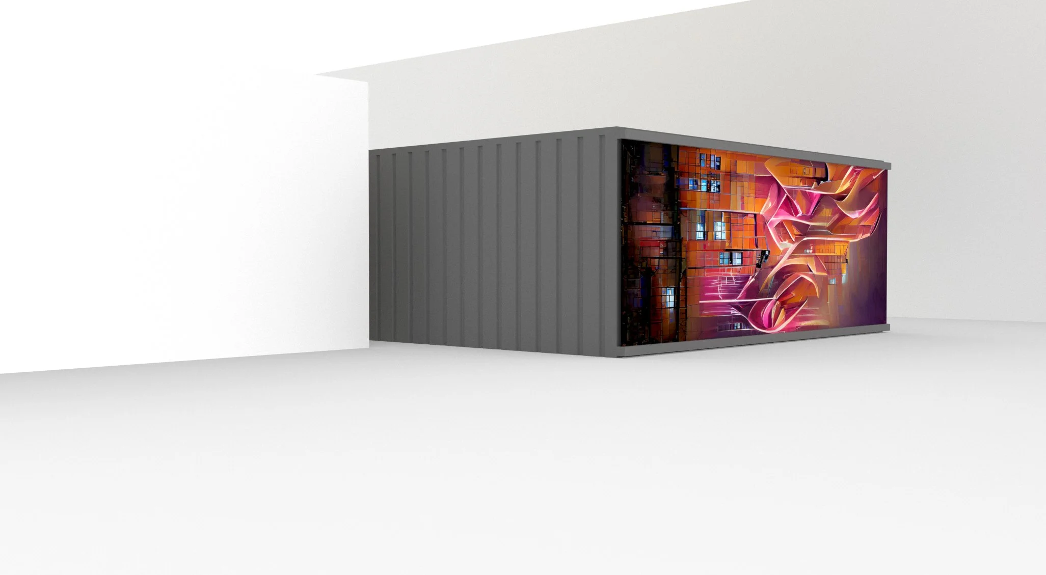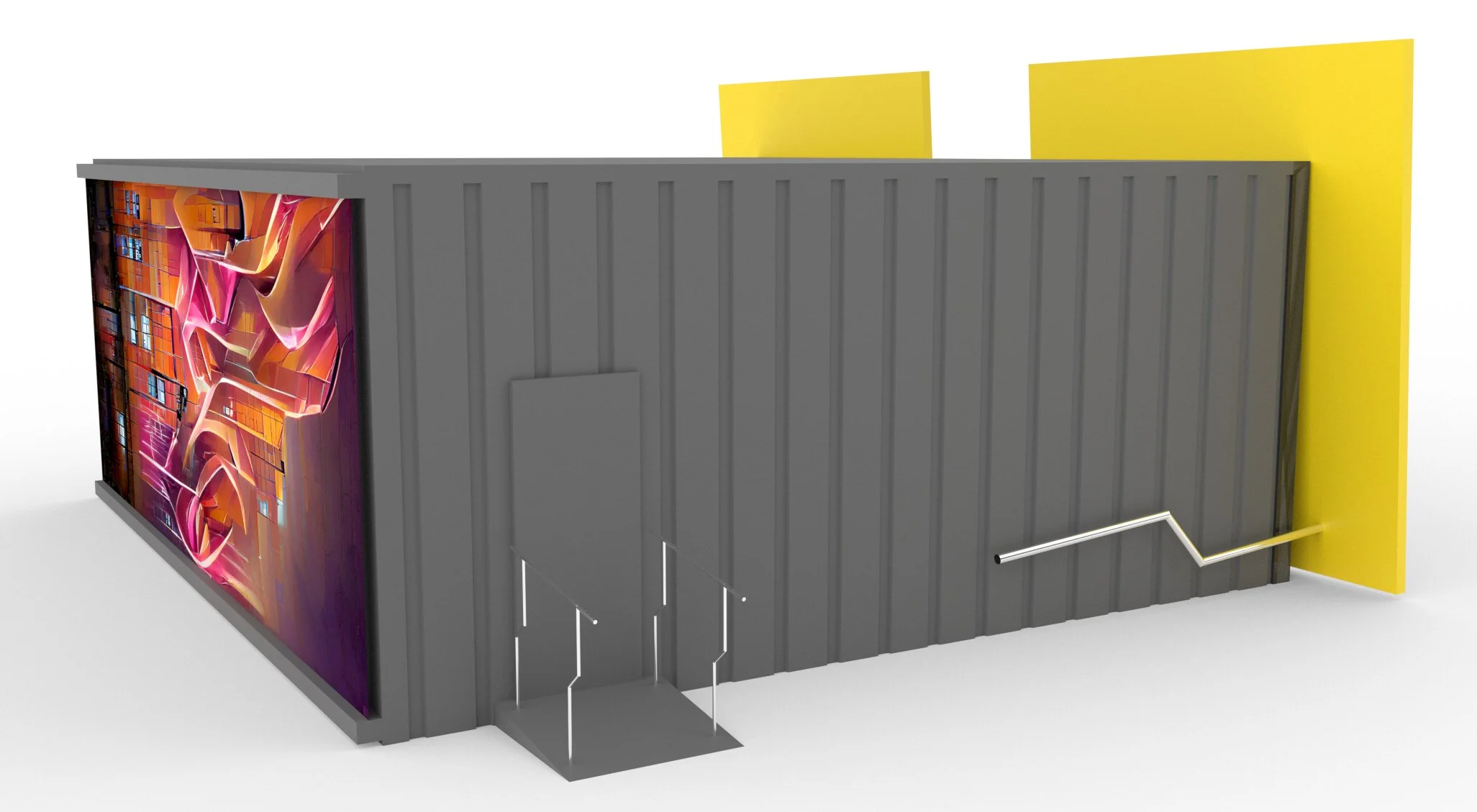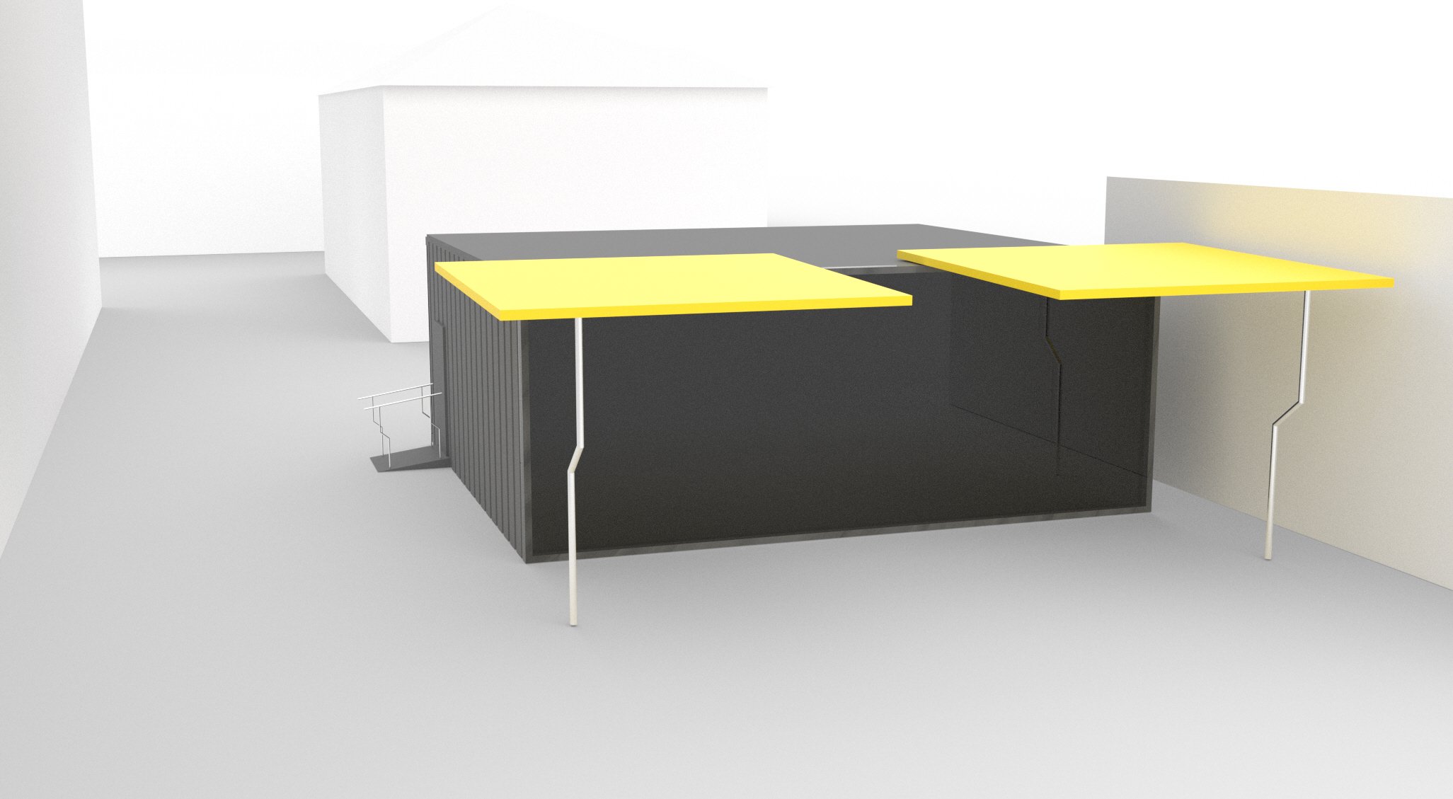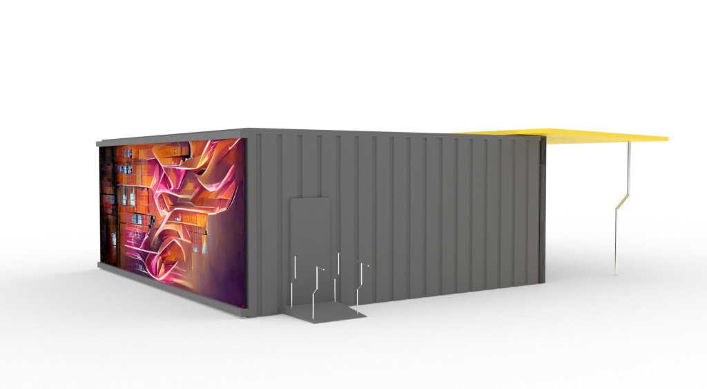 Concept for a double shipping container as a creative workspace aligned with the material language and CI of the Stadtlagerhaus Regensburg. One side was opened and closable sun-shading panels and a glazed wall element were used to switch between open and closed states, supported by tube-based structural elements.