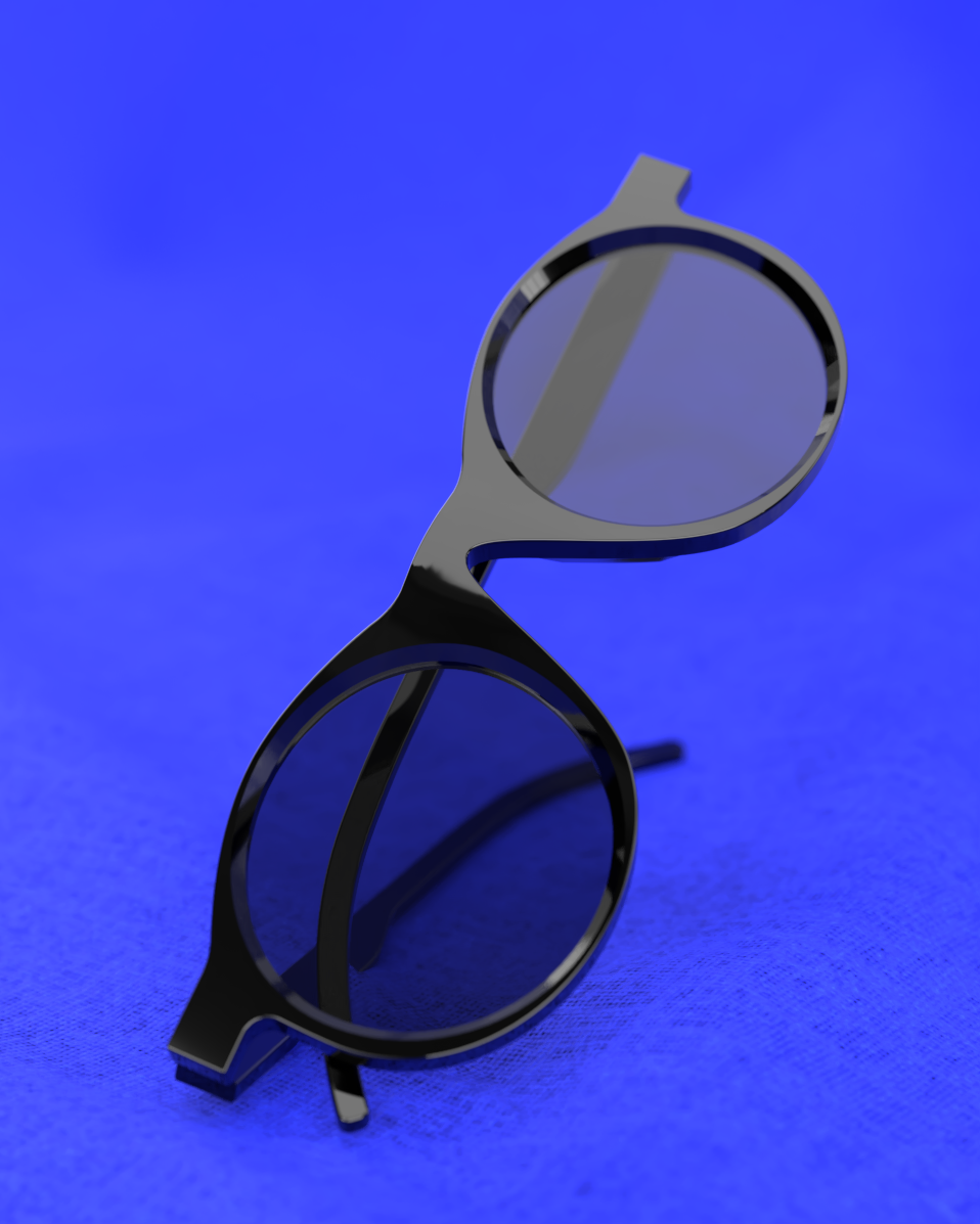 Eyewear concept combining round lenses with a lightly angular frame to achieve a visually neutral, everyday silhouette. Details include a pointed bridge cut-out and sharp temple connections within an otherwise reduced geometry.