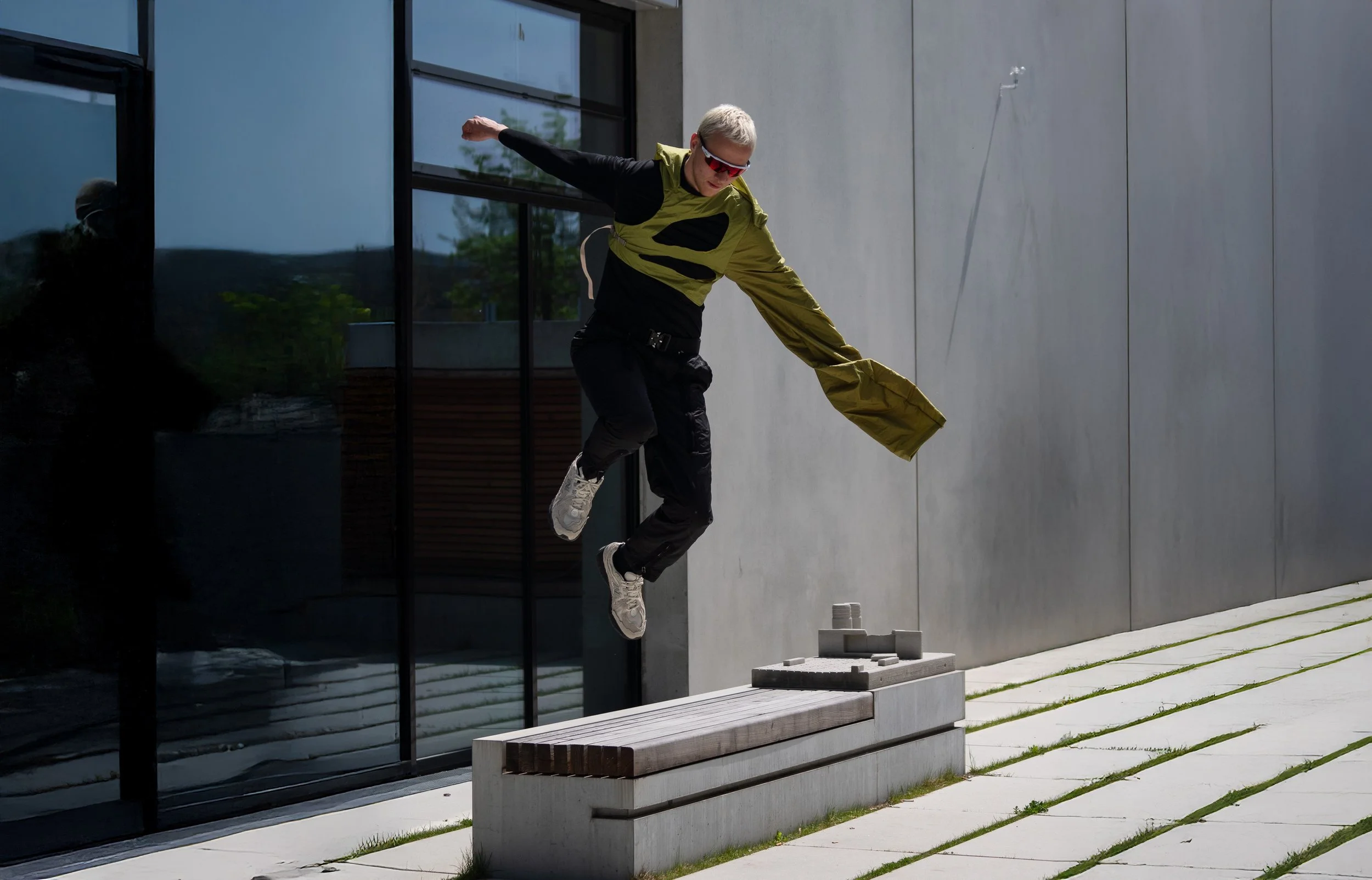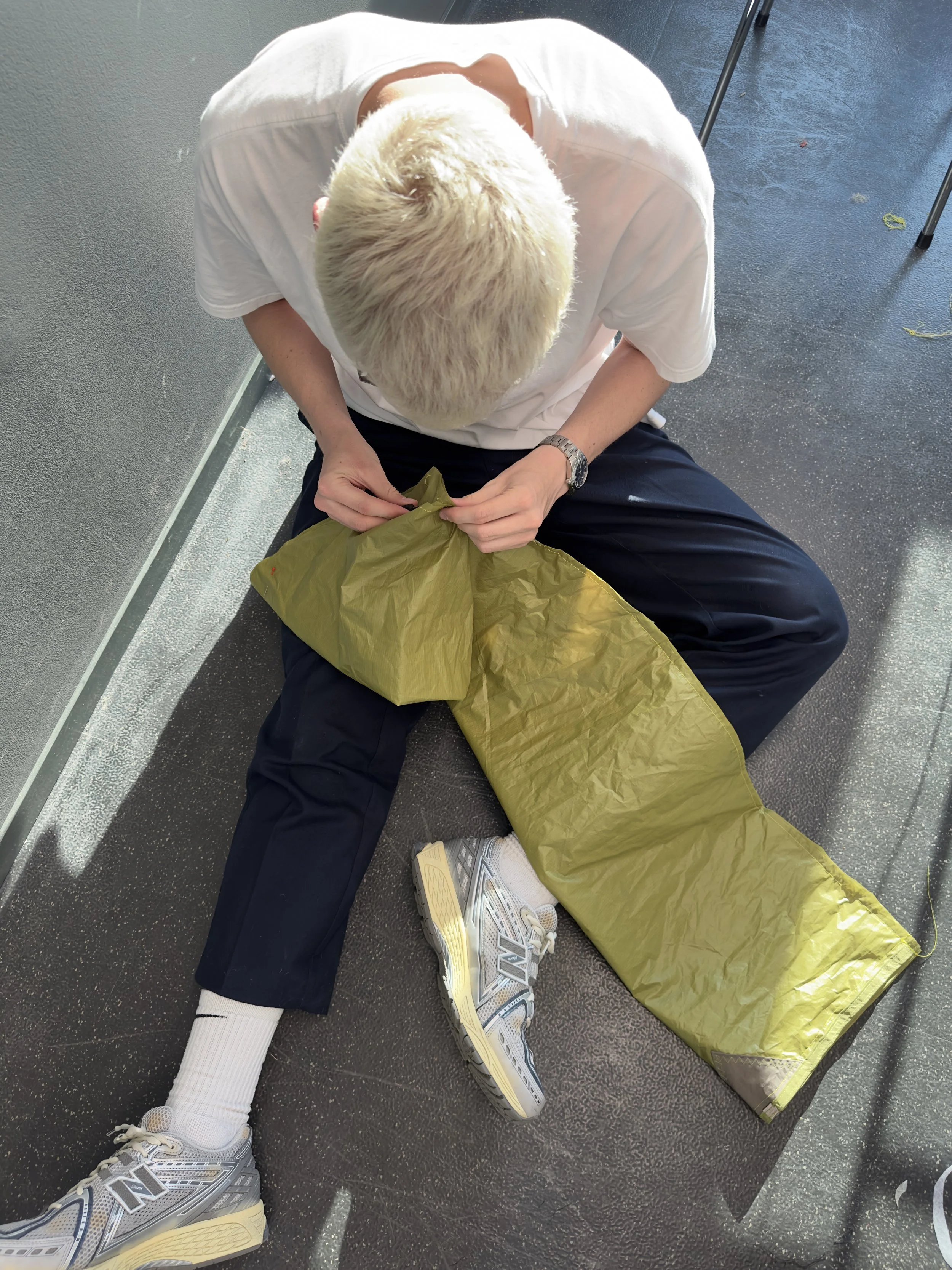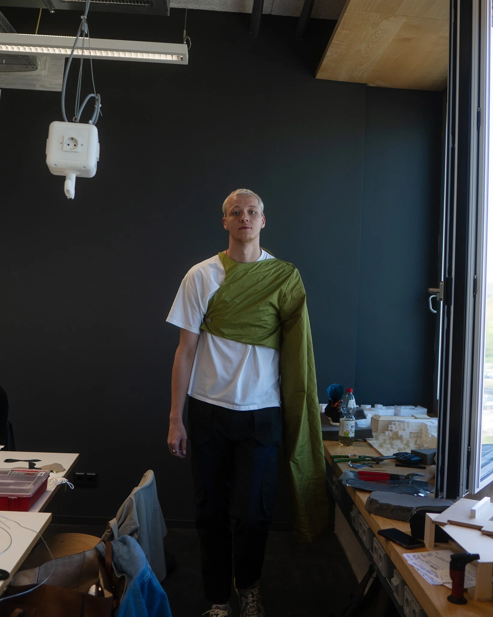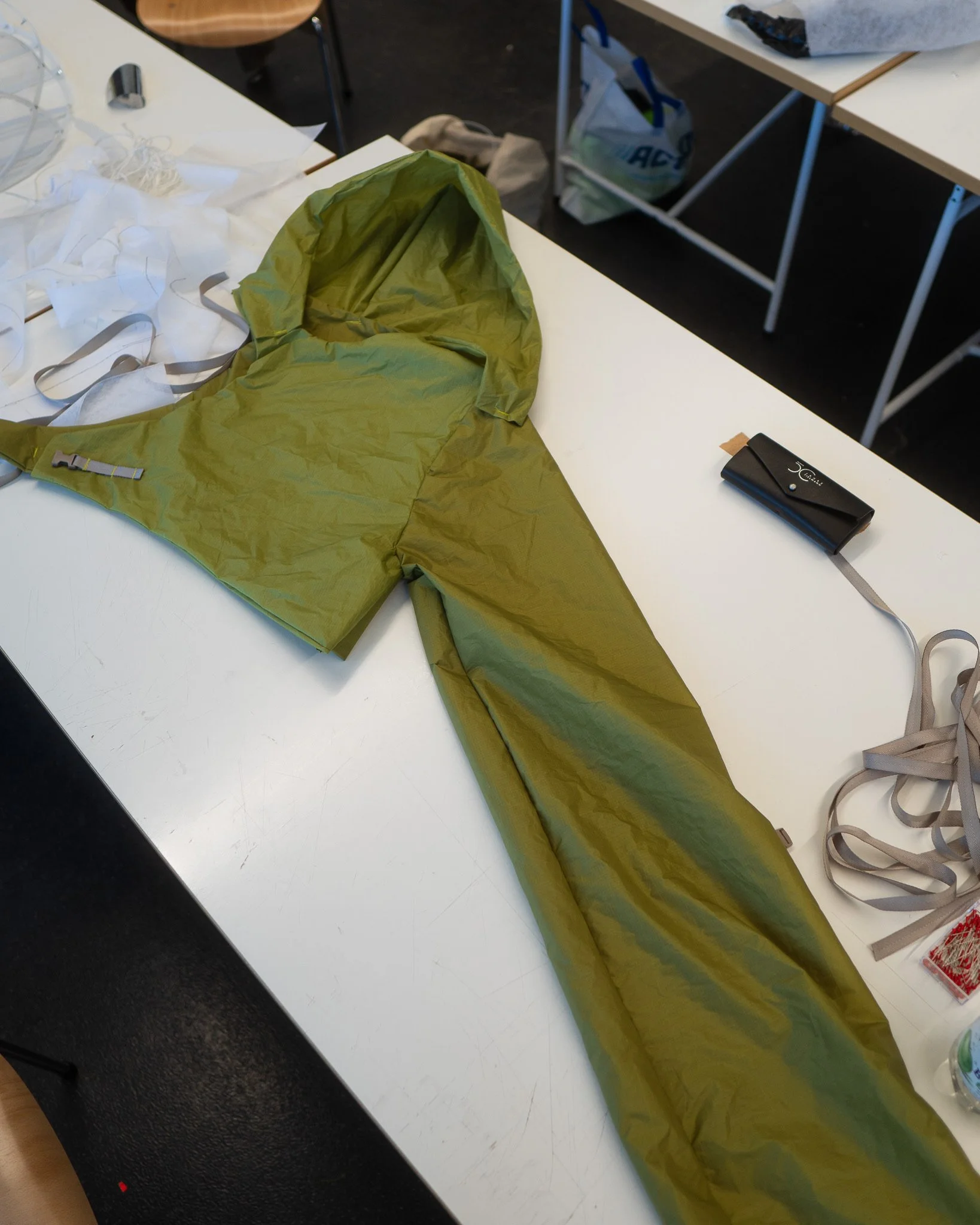 Asymmetric hooded harness made from reclaimed green tent fabric, with cut-out torso panels and an extended single sleeve; developed, produced, and presented within a four-day workshop through runway and photo presentation.