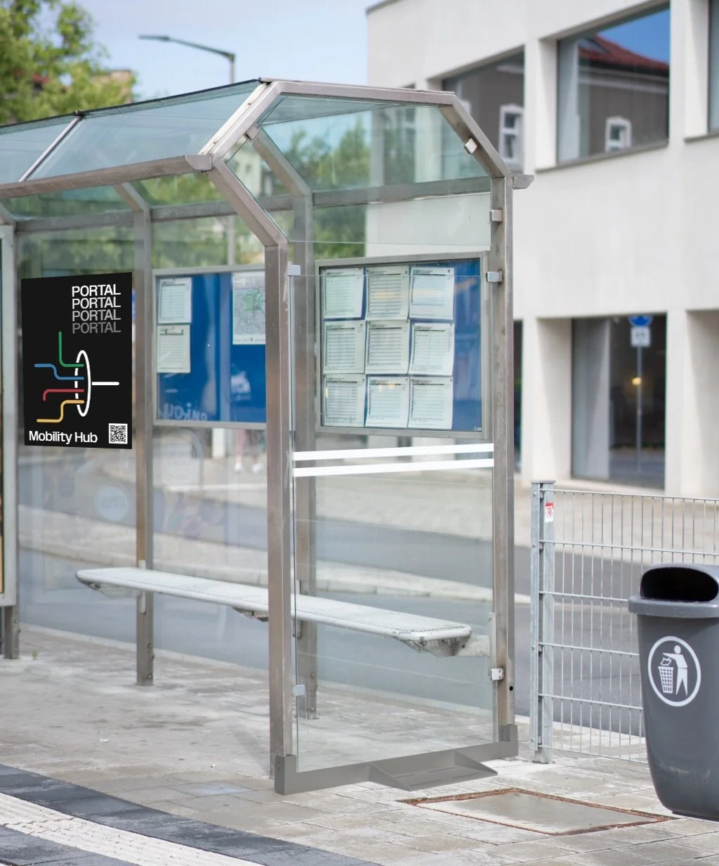 Concept for upgrading existing bus-stop micro-architecture into mobility hubs via a modular floor plate mounted to the existing foundation for add-ons such as charging points and service stations. A QR-linked web portal aggregated local mobility providers and location-based infrastructure to support intermodal routing without app installation.