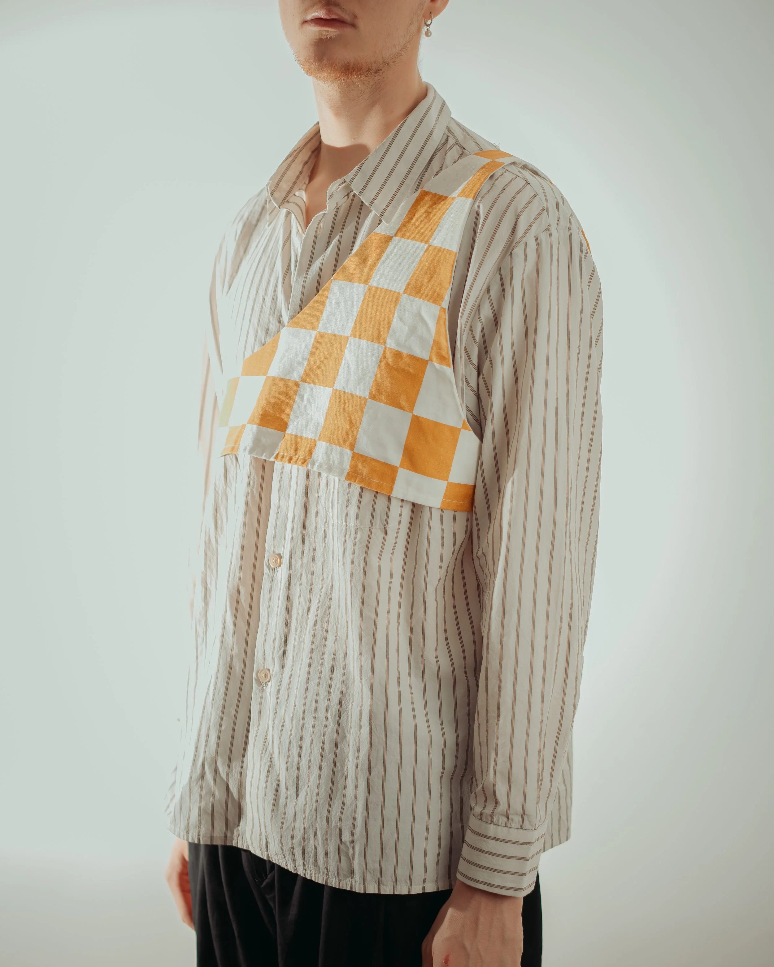 Asymmetric cropped harness–vest hybrid made from an upcycled yellow–cream checkered denim jacket, lined with a reused T-shirt. Designed to be worn over or under clothing, with a reversible left/right shoulder orientation to shift the silhouette.