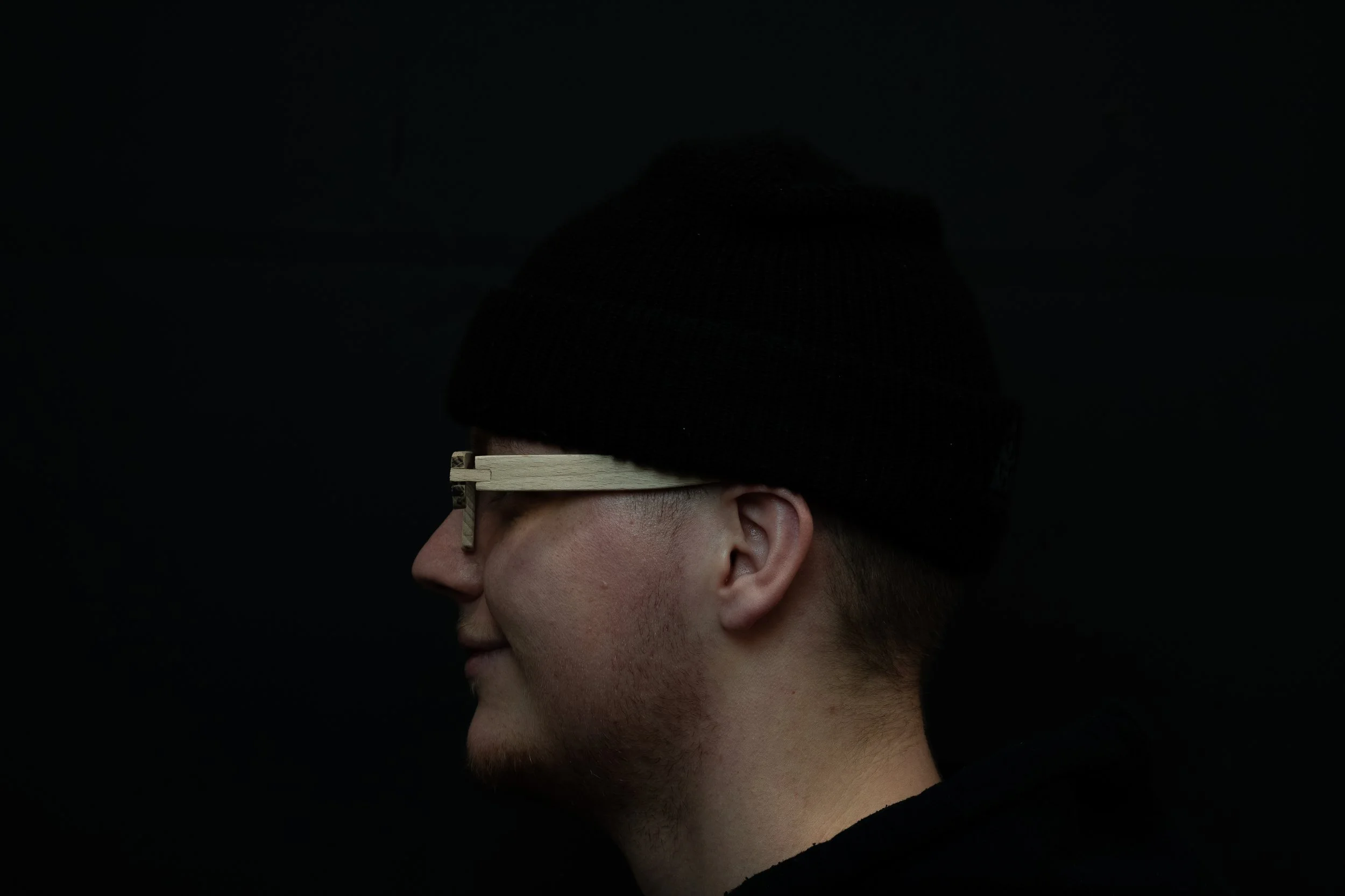 A foldable wooden eyeglass frame developed for the Erzgebirge woodworking context, designed around mirrored and repeated parts for serial production. The frame uses traditional ring-turning to fabricate consistent wooden components and integrates two hinge variants, including a center fold in the front for compact storage.